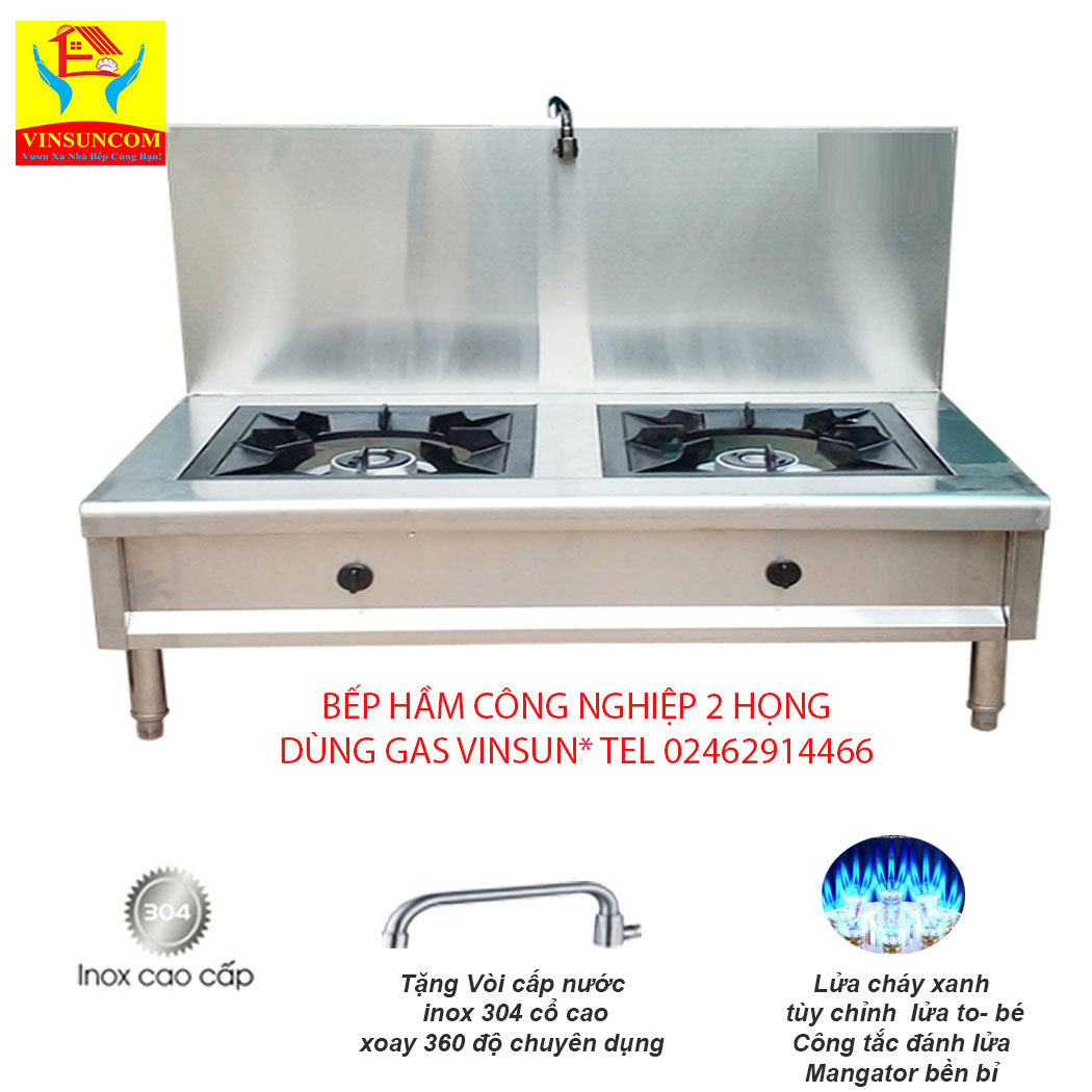 Bếp hầm công nghiệp 2 họng 1 vòi nước Vinsun hay bếp hầm nhà hàng trường học 2 họng. Bếp do Công ty Ứng dụng công nghệ Việt Nam trực tiếp sản xuất và phân phối trên cả nước. Bếp dùng họng gas công nghiệp chuyên dụng Việt Nam, đánh lửa dạng Mangator siêu bền, kiềng gas vuông và liền khối. Đặc biệt, bếp được trang bị Vòi cấp nước nấu nấu chuyên dụng. Lửa cháy xanh, có nhiều mắt dẫn lửa và tùy chỉnh hiệu suất dễ dàng. Tất cả tạo lên sản phẩm bền đẹp, dùng tiện lợi, an toàn. Chính vì vậy sản phẩm được các Bếp trong Bệnh viện, trường học, khách sạn và cửa hàng trong trên 63 tỉnh thành tin dùng.