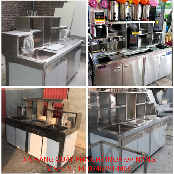 Quầy pha chế cafe trà sữa inox được VinSun thiết kế dựa theo những kích thước và số lượng những dụng cụ cần thiết để pha trà sữa. Do đó quầy bar khi nhìn qua chưa thực sự gây được ấn tượng, nhưng khi tìm hiểu kỹ bạn sẽ phải ngạc nghiên bởi sự tiện ích của quầy bar với những chi tiết như: bồn rửa tay, ngăn đựng đá, ngăn đựng đồ, khung chứa thiết bị….