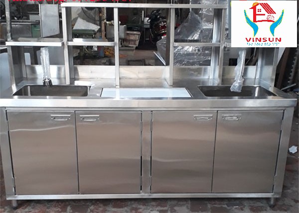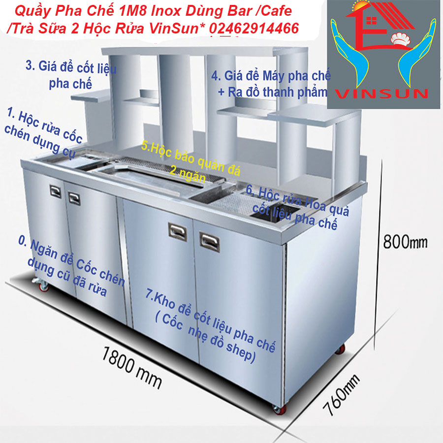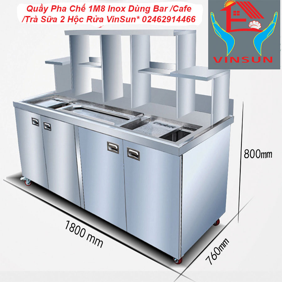 Ưu Việt Sử Dụng- Quầy Pha Chế 1M8 Inox Dùng Bar Cafe Trà Sữa 2 Hộc Rửa VinSun