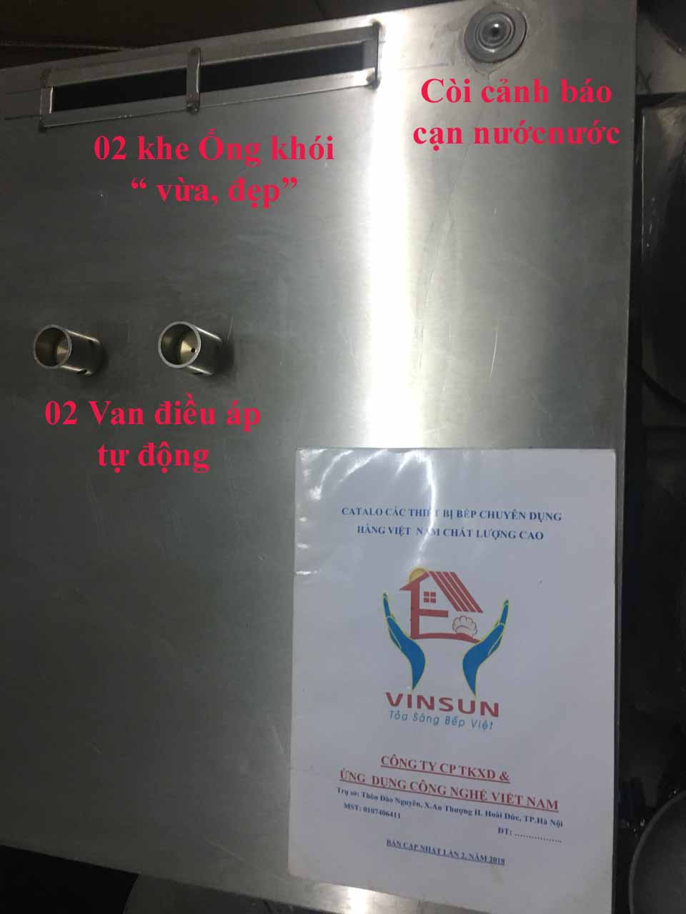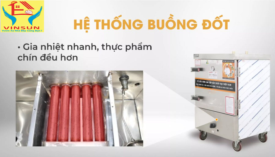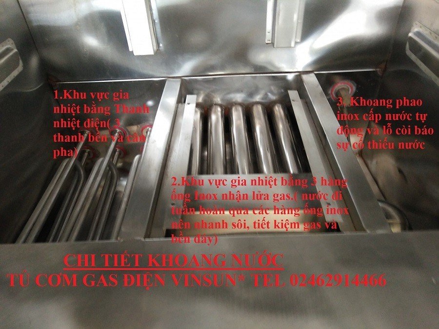 Tủ được sản xuất bởi Cty Ứng dụng công nghệ Việt Nam chín cơm bằng hơi nước, được trang bị hệ thống bảo vệ nhiều lớp để cách nhiệt và giữ nhiệt. Tủ Cơm sử dụng an toàn, tiện lợi hệ thống gas và nước. Tủ cơm công nghiệp này bền đẹp, sang trọng các thiết bị cả trong và ngoài tủ. Điện máy VinSun đi đầu về công nghệ sản xuất tủ cơm gas, đến nay tủ được trang bị Còi báo chống cạn nước, đồng hồ báo nhiệt và thanh magie chống bám bẩn khoang nước. Đặc biệt, Tủ nấu cơm tiết kiệm đến 60% gas. Sau khi nấu, cơm ngon từng hạt nên tủ cơm được các Khánh sạn, Nhà hàng, bệnh viện… cả nước tin dùng.