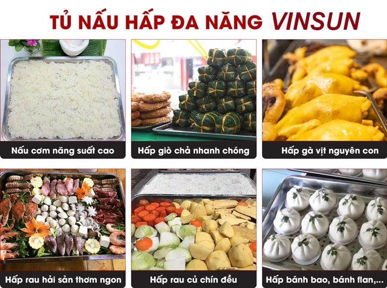 Với kinh nghiệm trên 8 năm trong lĩnh vực thiết bị nhà bếp và đặc biệt là tủ nấu cơm, Tủ hấp cơm. Công ty chúng tôi đã nghiên cứu và sản xuất thành công loại tủ nấu cơm, tủ cơm công nghiệp mang thương hiệu của người Việt Nam có tên Tủ nấu cơm điện 4 khay mini Việt Nam. Tủ cơm giúp cho người đầu bếp bớt vất vả trong quá trình chuẩn bị nhiều suất ăn, tăng thành phẩm cơm và giảm điện khi nấu cơm. Tủ nấu cơm điện 4 khay VinSun có thể nấu tối đa 7 kg gạo/lần/45 phút, tương ứng là 30-50 xuất ăn/ lần. Tủ Nấu Cơm Điện sản xuất tại Việt Nam còn dùng để Nấu cơm rượu, hấp gà, hấp hải sản, hấp rau củ quả tại các Nhà hàng, cửa hàng, nhà máy trong cả nước.